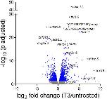 Figure 2. Differential expression analysis of control and T3 transcriptomes in NPSCs. Volcano plot (−log10 adjusted P-value vs log2 fold-change) for the comparison between untreated and T3 libraries. Blue dots represent differential expression genes found using DESeq2 (adjusted P-value < 0.05). Selected gene names are included (See text for details)