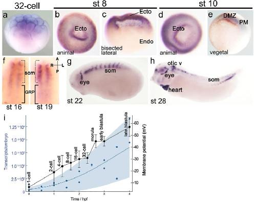 Levin, Asymmetries in H+/K+-ATPase and cell membrane potentials comprise a very early step in left-right patterning. 2002, Pubmed , Xenbase
