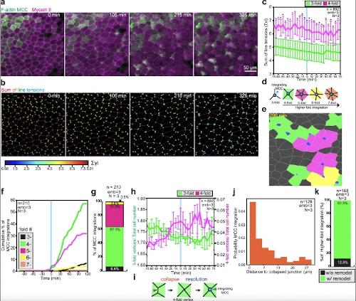 Supplementary Fig. 6 MCCs pull on overlying epithelial vertices to induce junction collapse. a-k, Orange vertical bars and arrowheads mark the onset of epithelial junction collapse, cyan vertical bars and arrowheads mark the onset of junction retraction. a, Schematics representing epithelial junction (in magenta) collapse quantification during MCC (in green) integration. t=0 indicates the start of epithelial junction collapse, which coincides with MCC reaching the overlying junction. b, Average normalized junctional myosin-II intensity (magenta) and junction length (purple) before and during junction collapse (t=0, the start of junction collapse)(n=9 junctions from 4 embryos, N=3 experiments). c, Average normalized MCC F-actin intensity (green) and junction length (purple) before and during junction collapse (t=0, the start of junction collapse)(n=7 junctions from 4 embryos, N=3 experiments). d, Normalized junctional myosin-II intensity (magenta) and normalized MCC F-actin intensity (green) during junction collapse (t=0, the start of junction collapse)(n>7 junctions from 4 embryos, N=3 experiments). |