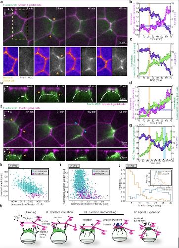 e,g,i, Image sequence depicting epithelial junction retraction after MCC (pseudo colored in green) loses contact (marked by cyan arrowheads) with the vertex. Junctions are labeled with nectin Utrophin-RFP in e, SF9-3xGFP in g and LSR-3xGFP in i. White dotted line marks the cell of interest, the yellow dotted line marks the competing MCC. The yellow and white arrows mark contact formation and loss with the vertex, respectively. f,h,j, Corresponding MCC F-actin intensity in grey values (green) and junction length (purple) during junction retraction. k, Average normalized MCC F-actin intensity (green) and junction length (purple) before and after retraction (marked by t=0)(n=5 junctions from 4 embryos, N=3 experiments). b-d, k, data show mean ± SEM. |