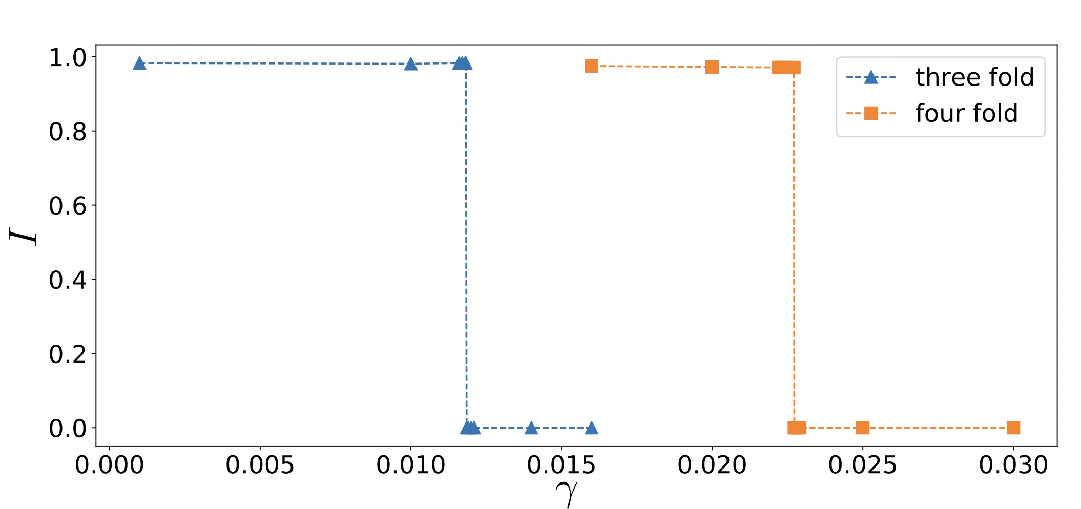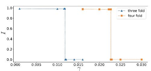 Supplementary Figure 11. Comparing the line tension criteria for MCC intercalation by computing the order parameter I, defined as the ratio of area of intercalated cell at force balance to the cell preferred area, for three-fold (blue) and four-fold (orange) vertices. The calculations are done in a hexagonal cellular network with a uniform line distribution (see Supplementary Note 1). |