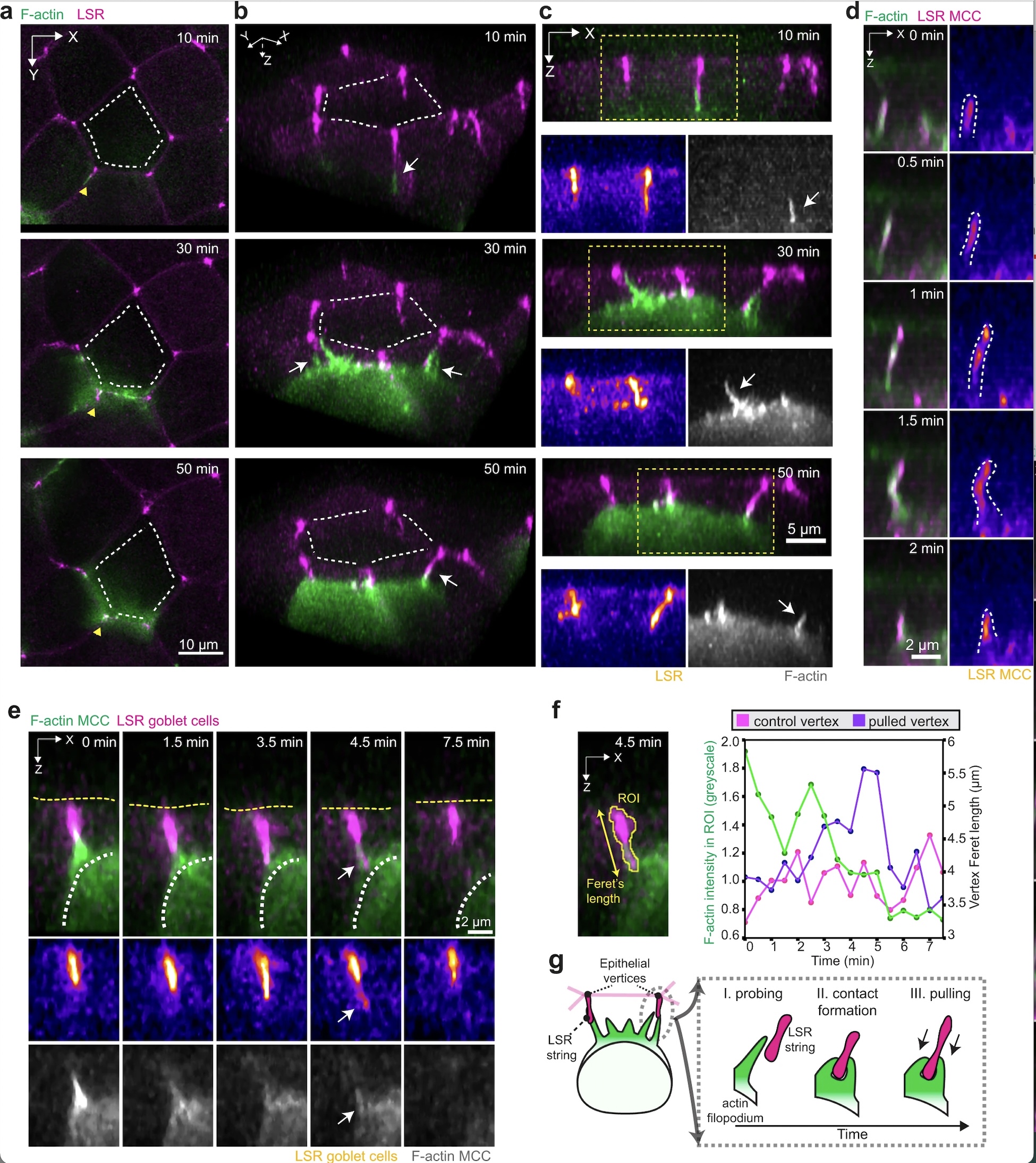 a–d Filopodia interact with epithelial vertices as MCC moves into the superficial epithelium. The actin cortex of MCCs is labeled with α-tubulin::LifeAct-RFP (pseudo-colored in green in composite images and gray as a separate channel). a Image sequence of integrating MCC interacting with overlying vertices. Epithelial vertices are labeled with lipolysis stimulated lipoprotein receptor tagged with x3GFP (LSR, pseudo-colored in magenta in composite images and fire as a separate channel). Scale bar: 10 μm. White dotted lines outline overlying junctions. The yellow arrowheads depict the orientation used for 3D rendering in b. b 3D rendering of a, with MCC forming contacts with different vertices (marked by white arrows). White lines outline overlying junctions. c Orthogonal (XZ) projections of a, depicting the attachment between filopodia (marked by white arrows) and vertices. Yellow boxes mark insets for separate channels. Scale bar: 5 μm. d Close-up of LSR-GFP (pseudo-colored in magenta in composite and fire as a separate channel) localization within a growing and retracting filopodium, visualized by F-actin marker (LifeAct, pseudo-colored in green). LSR is visualized by expressing α-tubulin::LSR-GFP. Scale bar: 2 μm. e Orthogonal (XZ) projections of filopodium pulling on the epithelial vertex (marked by white arrows). The epithelial vertex is marked by expressing nectin::LSR-GFP. The white dotted line outlines the MCC contour and the yellow dotted line outlines the apical surface of the superficial epithelium. Scale bar: 2 μm. f Quantification of vertex pulling from e. The MCC F-actin intensity (green) and vertex length during one event of vertex pulling (purple) and for a non-pulled vertex (magenta). g Schematics representing MCC probing and vertex pulling. |