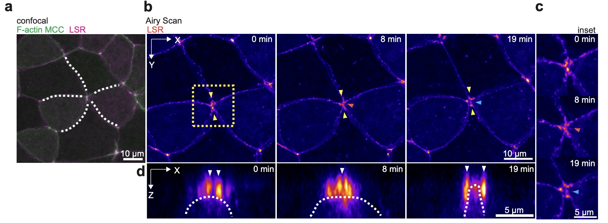 Supplementary Fig. 7: Live Superresolution Imaging of Rosette formation. Rosette formation during MCC integration. a, Confocal image of a rosette formation event which was then imaged using the Superresolution mode of the Airy Scan module (Airy Scan). b-d, Airy Scan imaging of rosette formation. Orange arrowheads marks formation of multi-fold vertex and blue arrowheads marks initiation of apical expansion. b, Epithelial vertices can be distinguished before (timepoint 0 min) and after MCC integration (timepoint 19 min). During integration (timepoint 8 min) the LSR strings cannot be easily distinguished from the LSR accumulated at the leading edge of the MCC. Yellow box outlines close-up in c and white arrowheads mark orientation of orthogonal projections in d. c, Close-up on rosette formation. d, Orthogonal (XZ) projections of rosette formation during MCC integration. White arrowheads mark vertex position. |