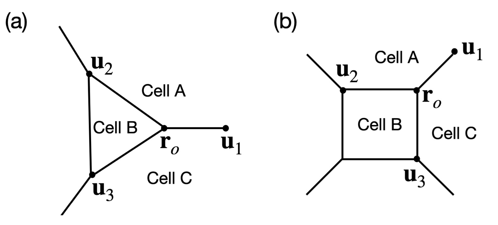 Supplementary Figure 12. Schematics of symmetric insertion of cell B at a three-fold vertex (a), and at a four-fold vertex (b) at location ro. Upon integration, each vertex of cell B is subject to forces stemming from the line tension of the 3 connected bonds in directions u1 ro, u2 ro and u3 ro and the pressure di↵erence between cell B and its neighboring cells A and C (see Supplementary Note 1). |