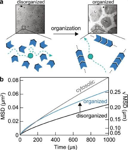Fig. 6. Organized cytoplasm optimizes short-range diffusion by reorganizing obstacle densities.a Schematic of the model: molecular and organelle reorganization optimizes molecular diffusion by creating longer mean free paths for diffusing molecules. The green object represents a protein of interest diffusing in the cytoplasm; the blue objects represent obstacles in the cytoplasm, such as organelles, cytoskeleton elements, and macromolecular complexes. In this model, proteins in organized cytoplasm remain free to diffuse in all directions. b Diffusion effects of molecular reorganization illustrated with mean squared displacement, MSD (t) = Γtα. The parameters {Γ, α} estimated for disorganized cytoplasm, organized cytoplasm and the cytosol are {8, 0.75}, {8.25, 0.70}, and {30, 0.85}, respectively. Note that based on the tradeoff between diffusion times and subdiffusivity in the organizing cytoplasm (Fig. 3a), we have assumed that the acceleration of protein movements over these distance scales comes at a cost of slower dynamics over longer distance scales. We also limit the comparison around the length scale of FCS measurements (~0.1–0.5 µm) since protein dynamics may show distinct characteristics at shorter and longer distance scales. Source data are provided as a Source Data file. |