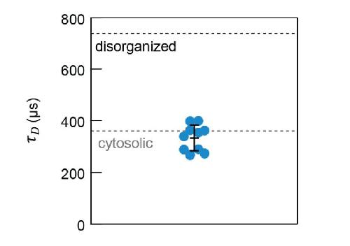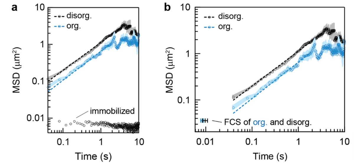 Figure 6. a Schematic of the model: molecular and organelle reorganization optimizes molecular diffusion by creating longer mean free paths for diffusing molecules. The green object represents a protein of interest diffusing in the cytoplasm; the blue objects represent obstacles in the cytoplasm, such as organelles, cytoskeleton elements, and macromolecular complexes. In this model, proteins in organized cytoplasm remain free to diffuse in all directions. b Diffusion effects of molecular reorganization illustrated with mean squared displacement, MSD (t) = Γtα. The parameters {Γ, α} estimated for disorganized cytoplasm, organized cytoplasm and the cytosol are {8, 0.75}, {8.25, 0.70}, and {30, 0.85}, respectively. Note that based on the tradeoff between diffusion times and subdiffusivity in the organizing cytoplasm (Fig. 3a), we have assumed that the acceleration of protein movements over these distance scales comes at a cost of slower dynamics over longer distance scales. We also limit the comparison around the length scale of FCS measurements (~0.1–0.5 µm) since protein dynamics may show distinct characteristics at shorter and longer distance scales. Source data are provided as a Source Data file. |