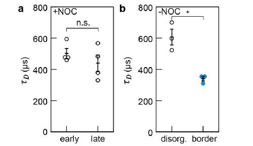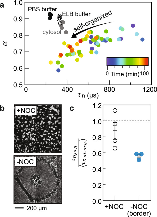 Figure 3. a FCS data from Fig. 2c–e consolidated in a parameter space of {α, τD}. b Nocodazole (NOC, 33 µM) abolishes self-organization of cytoplasm, visualized by ER-Red Tracker. c Nocodazole-treated cytoplasmic extracts show little changes in diffusion time (diffusion time ratio close to 1), compared with the sample without nocodazole at similar timepoints (<5 min). The y-axis shows τD normalized by the average τD from early timepoints (<20 min). Error bars, SEM. n = 4 and three measurements of different positions in an extract with and without nocodazole, respectively. Source data are provided as a Source Data file. |