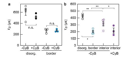 Figure 5. a, b Normalized diffusion times of BSA in actin-intact extracts, prepared without the addition of cytochalasin B (CyB). Note that the diffusion rate did not increase more during the self-organization of actin-intact extracts (open circles) than it did in actin-inhibited extracts (solid circles). The two panels are two independent experiments. c, d Degree of subdiffusion in actin-intact and actin-inhibited extracts. Data shown in panel c and d are from the same experiment shown in panel a and b, respectively. Error bars, SEM. n = {3, 3, 4, 5, 6; 3, 3, 3, 4, 5, 6, 3} measurements of different positions in an extract for data from left to right and top to bottom, respectively. Source data are provided as a Source Data file. |