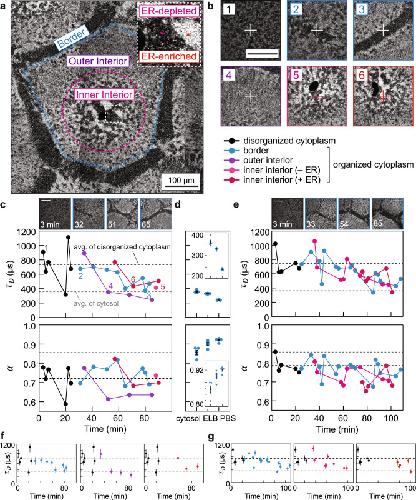 Figure 2. a, Spatial regions of self-organization (color-coded), classified by the ER morphology. The dark sphere near the center of the inner interior is the nuclei. The image was stitched from multiple confocal images. b Representative confocal images of FCS foci, which are marked by the crosshairs. The annotated numbers refer to snapshots taken prior to FCS measurements in c. c Tracing protein diffusion during self-organization by FCS. The plots show the characteristic diffusion times τD and the diffusion mode α obtained from fitting the FCS curves. Black and gray dashed lines correspond to averages from disordered cytoplasmic extracts (in this example, 740 µs, Deff = 11.9 µm2/s) and cytosolic extracts (360 µs, Deff = 24.7 µm2/s), respectively. d Benchmark measurements from cytosolic extracts and buffers. ELB, egg lysis buffer; PBS, Phosphate-buffered saline. Insets show zoom-in of the data. Each condition was measured five times; all data presented by error bars are mean ± SEM. n = 5 measurements of different positions in a sample. e, Biological repeat of c, prepared from a separate batch of eggs. f, g are isolated traces from c and e. Error bars, estimated errors (standard deviation) from curve fitting (each fitting was performed over n = 107 data points). Scale bars, 100 µm. Source data are provided as a Source Data file. |