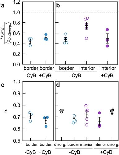 Figure 5. a, b Normalized diffusion times of BSA in actin-intact extracts, prepared without the addition of cytochalasin B (CyB). Note that the diffusion rate did not increase more during the self-organization of actin-intact extracts (open circles) than it did in actin-inhibited extracts (solid circles). The two panels are two independent experiments. c, d Degree of subdiffusion in actin-intact and actin-inhibited extracts. Data shown in panel c and d are from the same experiment shown in panel a and b, respectively. Error bars, SEM. n = {3, 3, 4, 5, 6; 3, 3, 3, 4, 5, 6, 3} measurements of different positions in an extract for data from left to right and top to bottom, respectively. Source data are provided as a Source Data file. |