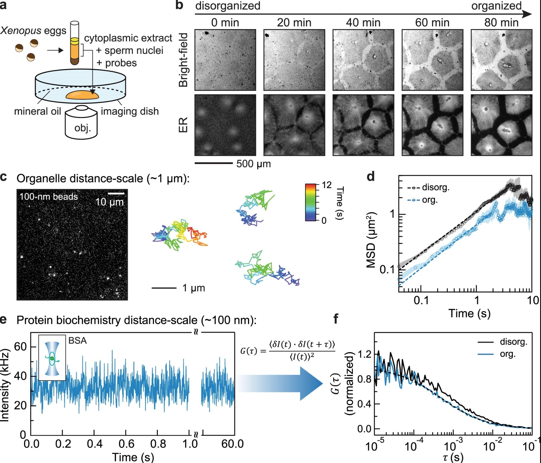 Figure 1. a Schematic of the experimental setup used in this study: Xenopus laevis eggs were fractionated to obtain the undiluted cytoplasmic extract, which was then deposited on the surface of an imaging dish and covered with mineral oil. b Time-lapse images of the self-organizing cytoplasm, visualized with 1 µM ER-Tracker Red dye. c Image (left) of dilute 100-nm (diameter) microspheres in extracts. Trajectories (right) are examples from single-particle tracking in the organized cytoplasm (interior regions in Fig. 2a). The relative positions between the three tracked particles were adjusted for display (they were tens of microns apart in the extracts). d Ensemble mean squared displacement (MSD) analysis derived from the single-particle tracking. Shaded area, standard error of the mean (SEM). Dashed lines are fitting to MSD(t)=Γtα, where Γ is the generalized diffusion coefficient34. The fitted {Γ, α} for disorganized and organized cytoplasm are {1.12, 0.75}, and {0.65, 0.78}, respectively. The localization error of these SPT experiments, quantified with immobilized microspheres, was below 0.01 µm2 (Supplementary Fig. 1a). e, f Representative FCS data of BSA-Alexa Flour 488 in cytoplasmic extracts. The full intensity trajectory (60 s) is shown in Supplementary Fig. 2c. The inset depicts a molecule diffusing through a confocal spot. G(τ) is the autocorrelation function, where τ is the lag time; δI(t)=I(t)−⟨I(t)⟩, where I(t) is the fluorescence intensity and the brackets denote time averages. The autocorrelation curve was fitted by an anomalous diffusion model (dashed line). In this example, the number of particles was 42, and the average intensity (shown in e) was 32 kHz, corresponding to a molecular brightness of 0.76 kHz/molecule. Source data are provided as a Source Data file. |