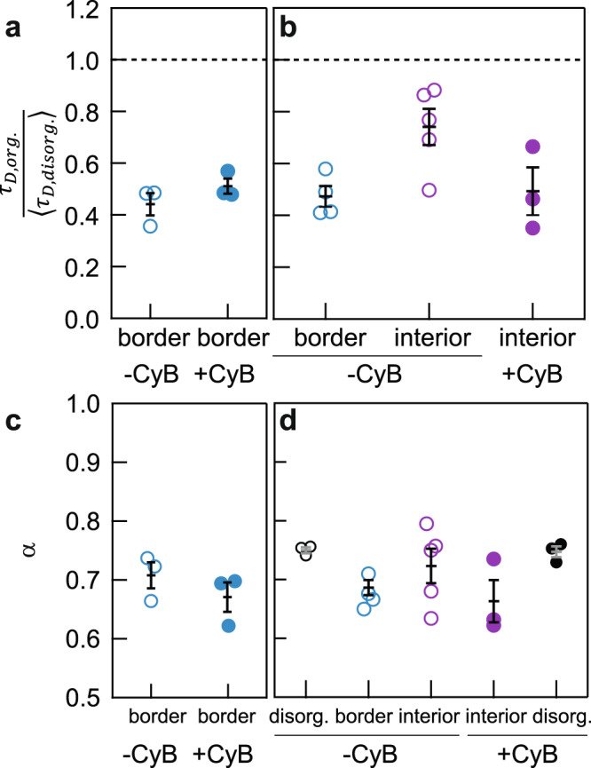Fig. 5. Protein diffusion in actin-intact extracts.a, b Normalized diffusion times of BSA in actin-intact extracts, prepared without the addition of cytochalasin B (CyB). Note that the diffusion rate did not increase more during the self-organization of actin-intact extracts (open circles) than it did in actin-inhibited extracts (solid circles). The two panels are two independent experiments. c, d Degree of subdiffusion in actin-intact and actin-inhibited extracts. Data shown in panel c and d are from the same experiment shown in panel a and b, respectively. Error bars, SEM. n = {3, 3, 4, 5, 6; 3, 3, 3, 4, 5, 6, 3} measurements of different positions in an extract for data from left to right and top to bottom, respectively. Source data are provided as a Source Data file. |