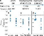 Supplementary Figure 9: Statistical tests of BSA diffusion in actin-intact cytoplasmic extracts. Mann–Whitney U tests for data in Fig. 5. Asterisks (*) denotes the significance levels calculated as two-tailed p-values: **, 𝑝 ≤ 0.05; *, 𝑝 ≤ 0.15; n.s., not significant, 𝑝 > 0.15. The p-values for a and b are {0.34, 1.00} (from left to right), and {0.036, 0.032, 0.071, 0.057} (from top left to top right to bottom), respectively. The two panels show data from two independent experiments. Error bars, SEM. n = 4, 3, 3, 3, 3, 4, 5, and 3 measurements of different positions in an extract for data from left to right, respectively. Source data are provided as a Source Data file. |