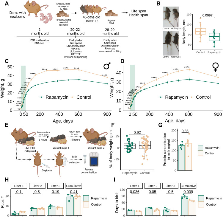 Development is tightly connected to aging, but whether pharmacologically targeting development can extend life remains unknown. Here, we subjected genetically diverse UMHET3 mice to rapamycin for the first 45 days of life. The mice grew slower and remained smaller than controls for their entire lives. Their reproductive age was delayed without affecting offspring numbers. The treatment was sufficient to extend the median life span by 10%, with the strongest effect in males, and helped to preserve health as measured by frailty index scores, gait speed, and glucose and insulin tolerance tests. Mechanistically, the liver transcriptome and epigenome of treated mice were younger at the completion of treatment. Analogous to mice, rapamycin exposure during development robustly extended the life span of Daphnia magna and reduced its body size. Overall, the results demonstrate that short-term rapamycin treatment during development is a novel longevity intervention that acts by slowing down development and aging, suggesting that aging may be targeted already early in life.