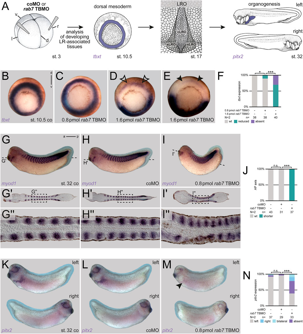 FIGURE 1. Rab7 is necessary for correct LR axis development. (A) Experimental setup for the shown experiments: Injections at four-cell stage (left) targeted the dorsal mesoderm to analyze mesoderm specification (tbxt; middle-left) at gastrula stages, a prerequisite for the formation of the dorsal mesoderm derived LRO (middle-right) in wild type situation during neurula stages, which in turn induces LR asymmetric features (here pitx2 expression; right) at tailbud stages. (B) Wild type circular tbxt expression of st. 10.5 control specimen, (C) injection of reduced amounts of rab7 TBMO did not alter tbxt expression, (D) whereas higher doses reduced transcripts (black outlined arrowheads) or (E) abolished them in the targeted dorsal lineage (black arrowheads). (F) Quantification of tbxt expression. (G) Uninjected st. 32 tadpole, or specimen injected with (H) coMO depicted wild type axis elongation compared to (I) shortened axis of rab7 TBMO treated specimens. (G′–I′) Please note in frontal sections through somitic lineage that all specimen showed myod1 expression in somites along AP-axis. (G′′–I′′) Magnification of myod1 expressing somites as indicated in dashed boxes, respectively. Please note altered somite shapes in morphants. (J) Quantification of axis phenotype. (K) Left-sided pitx2 expression in untreated st. 32 tadpoles and (L) coMO injected ones. (M) Lost left-sided pitx2 expression upon rab7 knockdown (black arrowhead). (N) Quantification of pitx2 expression. a, anterior; cLRO, central LRO; co, control; coMO, control Morpholino oligomere; d, dorsal; l, left; LRO, left-right organizer; N, number of experiments; n, number of evaluated embryos; n.s., not significant; p, posterior; pmol, picomole; r, right; sLRO, somitic LRO; st., stage; TBMO, translation blocking Morpholino oligomere; v, ventral; wt, wild type. |