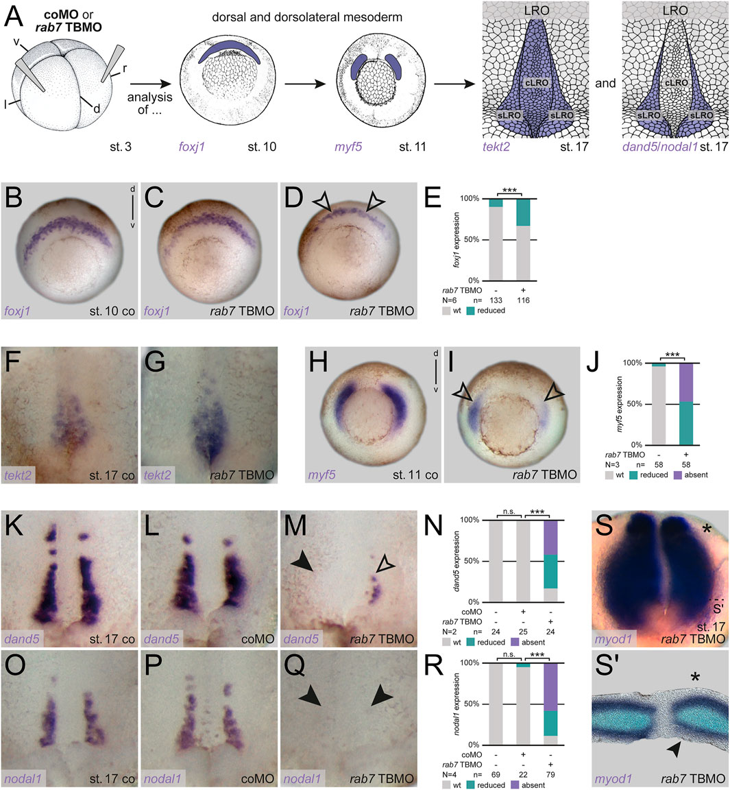 FIGURE 2. Rab7 knockdown resulted in loss LRO sensor tissue. (A) Experimental setup for the shown experiments: Injections at four-cell stage (left) targeted the dorsal/dorsolateral mesoderm to analyze superficial mesoderm induction (foxj1; middle) or somitic mesoderm specification (myf5; middle) at gastrula stages, following analyses of general LRO formation (tekt2; right) or sLRO specification (dand5/nodal1; right) during neurulation. (B) Wild type crescentic foxj1 transcripts were (C) unaltered or (D) mildly affected by low dose rab7 TBMO injections (black outlined arrowheads). (E) Quantification of foxj1 expression. (F) Expression domain of tekt2 in the LRO of st. 17 embryos, (G) depicted slightly stronger posterior and reduced anterior signals upon low dose rab7 TBMO treatment. (H) Wild type dorsolateral myf5 expression (I) was significantly reduced in rab7-morphant embryos (black outlined arrowheads). (J) Quantification of myf5 expression. (K,O) Expression of dand5 and nodal1 in the somitic domains of the LRO of control and (L,P) coMO injected specimen, respectively. (M) Transcripts of dand5 or (Q) nodal1 were lost (black arrowheads) or severely reduced (black outlined arrowheads) in rab7-deficient embryos (low dose TBMO). (N,R) Quantification of dand5 and nodal1 expression, respectively. (S) Left-sided unilateral knockdown (marked by asterisk) of low dose rab7 TBMO in myod1 expressing LRO, (S′) section revealed lost superficial expression of myod1 at injection side (black arrowhead). cLRO, central LRO; co, control; coMO, control Morpholino oligomere; d, dorsal; l, left; LRO, left-right organizer; N, number of experiments; n, number of evaluated embryos; n.s., not significant; r, right; sLRO, somitic LRO; st., stage; TBMO, translation blocking Morpholino oligomere; v, ventral; wt, wild type. |