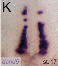 dand5 (DAN domain family member 5, BMP antagonist) gene expression in X. laevis embryo, NF stage 17, in the somitic domains of the LRO (Left Right Organizer) of the gastrocoel roof plate. |
