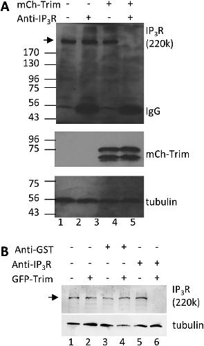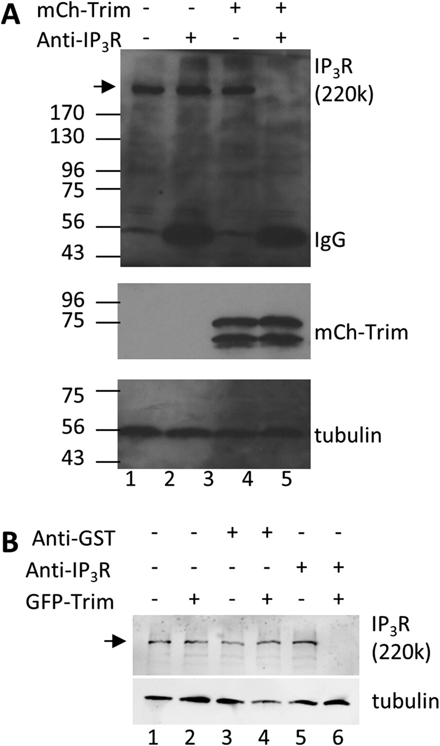 FIGURE 1: TrimAway IP3R in Xenopus oocytes. (A) Control oocytes and oocytes injected with mCherry-Trim21 mRNA were incubated for 24 h followed by injection with anti-IP3R antibodies, as indicated. Oocytes were lysed 4 h after antibody injection for immunoblotting, first using anti-IP3R antibodies followed by and anti-β-tubulin antibodies. Molecular weight markers are shown. Arrow depicts IP3R. Representative of three independent experiments. (B) Control oocytes and oocytes injected with eGFP-Trim21 mRNA were incubated for 24 h followed by injection with anti-IP3R antibodies or anti-GST antibodies, as indicated. Four hours following antibody injection, oocytes were lysed for immunoblotting using anti-IP3R antibodies or anti-tubulin antibodies. Arrow depicts IP3R. Representative of three independent experiments.