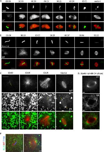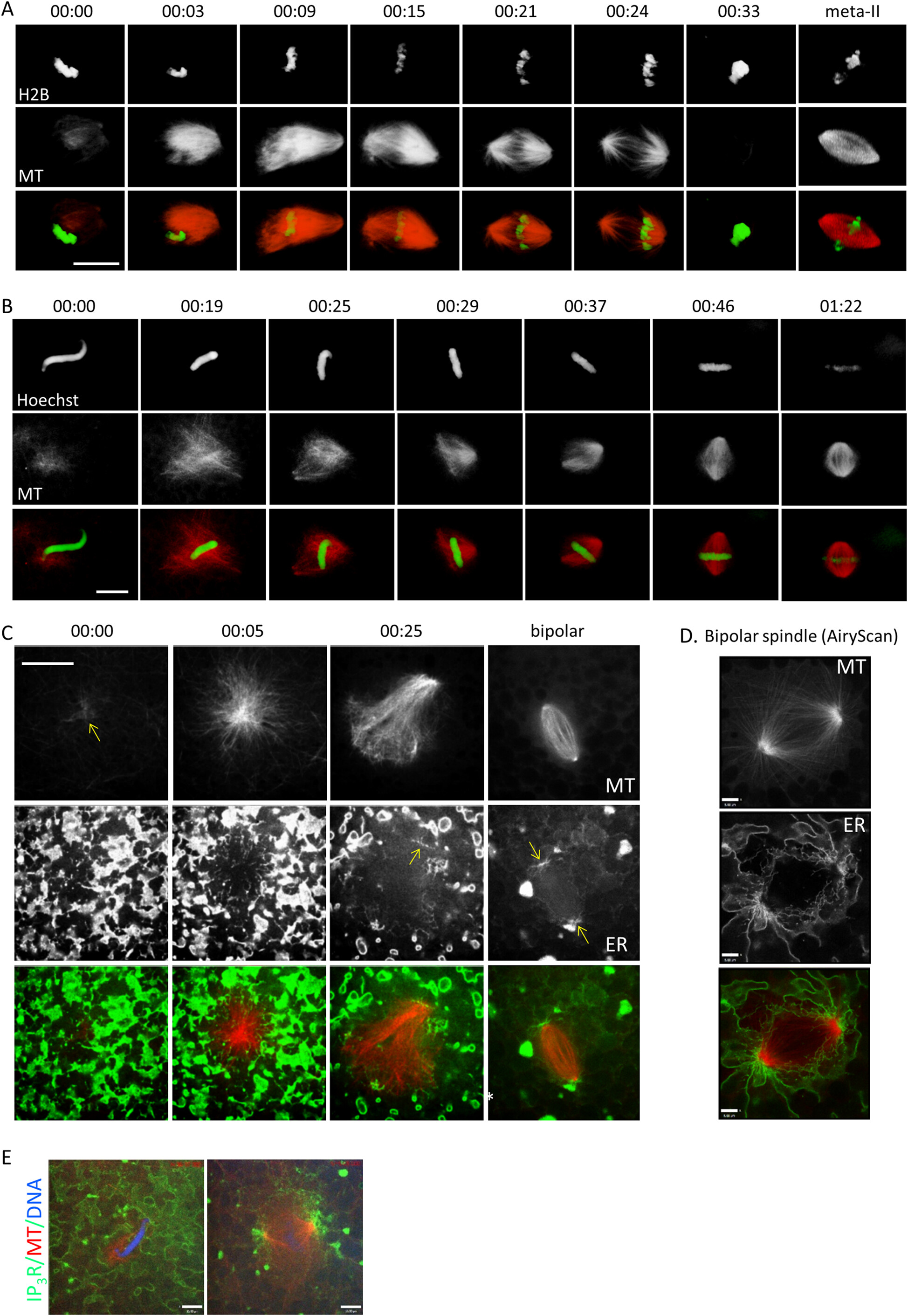 FIGURE 3:. A novel cell-free spindle assembly system. (A) MI extracts: oocytes expressing RFP-tubulin (red) and eGFP-H2B (green) are stimulated to undergo meiosis. Cytoplasm is aspirated from an MI oocyte (1hour after GVBD) and mixed with demembranated sperm nuclei. An aster was seen about 5 min after mixing (00:00; hh:mm), which rapidly enlarged (00:03) and became a monopolar (00:09) and then bipolar (00:15 and 00:21) spindle. Anaphase was observed where all chromosomes moved to the same pole (00:24) before microtubules disappeared (00:33) (9/9 or 100%). Metaphase II spindles appeared 1 h later (5/9 or 56%) and remained stable. Scale bar = 20 µm. (B) MII extracts: time series (hh:mm) of bipolar spindle formation from a single sperm in cytoplasm aspirated from a metaphase II arrested oocyte expressing RFP-tubulin (red). Hoechst dye (1 µg/ml) was added to sperm droplet to visualize DNA (green). The bipolar spindle is stable, usually for hours. Time 0 represents 5 min after mixing the cytoplasm with sperm. Scale bar = 20 µm. (C) Representative stages of extract spindle assembly in oocytes expressing sfGFP-ER3 (DNA injection) and RFP-tubulin. An aster formed in the microtubule-and ER tubules-rich oocyte extracts (00:00), which rapidly enlarged and was permeated by thinner ER tubules (00:09). In monopolar (00:25) and bipolar spindles, the thinner ER tubules were found concentrated at the poles (arrows). The bright ER blob (*) represented circular ER tubule stack. Scale bar = 20 µm. Shown are representative of >10 independent experiments. (D) High-resolution (AiryScan) single-plane confocal images through the center of a bipolar spindle assembled in cell-free cytoplasmic extract expressing sfGFP-ER3 and RFP-tubulin. Scale bar = 5 µm. Shown are representative of >10 independent experiments. (E) Enrichment of IP3R at spindle poles: Oocytes were injected with GFP-IP3R1 plasmid DNA and RFP-tubulin mRNA. Cytoplasmic extracts were aspirated from metaphase II-arrested oocytes and mixed with sperm droplets containing Hoechst dye (1 µg/ml). (Left) A microtubule aster was seen associated with a sperm 5 min after cytoplasm and sperm were mixed. (Right) A bipolar spindle depicting close association of spindle poles and IP3R-positive ER elements. Scale bar = 5 µm. Shown are representative images obtained in two independent experiments.