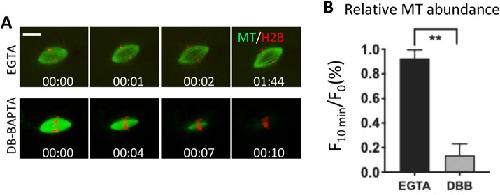 FIGURE 5: DB-BAPTA, but not EGTA, disrupt bipolar spindles in cell-free extracts. (A) Images of hh:mm. Scale bar = 20 µm. (B) The bar plot summarizes the relative microtubule abundance at 10 min after injection. Means ± SD; ** indicates p < 0.01; n = 4 (EGTA), n = 8 (DB-BAPTA).