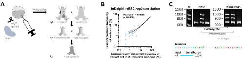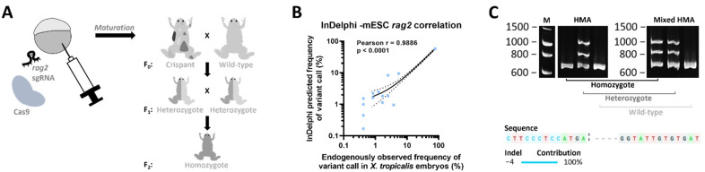 Figure 1. Generation of the X. tropicalis rag2−/− knockout line. (A) Embryos were injected with an sgRNA targeting the rag2 gene along with Cas9 protein. When sexually mature, animals were outcrossed to wild-types to obtain heterozygous animals that were subsequently incrossed to obtain rag2 homozygous mutant animals in the F2 generation. (B) Scatter plot showing correlation between in vivo observed mutational CRISPR repair outcomes in injected embryos (x-axis) versus predicted outcomes using the inDelphi algorithm tool (y-axis). Dashed lines show the 95% confidence interval corresponding to the best-fit linear regression line (solid line). (C) Genotyping of sampled F2 animals. Images taken from DNA electrophoresis gels after performing a normal HMA (left) and mixed HMA (right). Normal HMA included heating of the sampled PCR amplicons followed by slowly cooling and loading on the gel, while, for mixed HMA, sampled PCR samples were first mixed with wild-type rag2 amplicons, after which the HMA was performed. Multiple bands present in both gels indicate heterozygous animals, while extra bands only appearing after performing the mixed HMA (right gel) relate to homozygous mutant animals. Absence of any extra bands is indicative of wild-type animals. Presence of a 4 bp deletion in homozygous mutant animals was confirmed by Sanger sequencing.