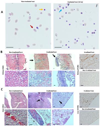 Figure 4. Engraftment of tp53−/− tumor cells in irradiated wild-type X. tropicalis froglet. (A) IP fluid from tumor cell transplanted irradiated and non-irradiated control animals, stained with Natt and Herrick reagent. Red and yellow arrows indicate an RBC and a lymphocyte, respectively. The blue arrow shows a tumor blast cell. (B) H and E- (left) and PCNA-stained (right) sections of engrafted regions in kidney (black arrows) from transplanted irradiated froglet compared with respective kidney sections in the transplanted non-irradiated control froglet. (C) H and E- (left) and PCNA-stained (right) sections of engrafted regions in liver (black arrows) from transplanted irradiated froglet compared with respective liver sections in the transplanted non-irradiated control froglet. All scale bars are 50 µm.