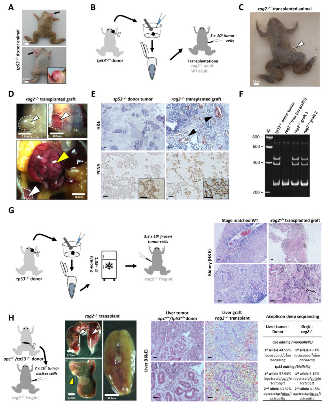 Figure 2. Validation of allografting in X. tropicalis rag2−/− animals. (A) tp53−/− donor animal harboring a thymic tumor (black arrows). (B) Transplantation strategy including the generation of a cell suspension using a 40 µm strainer followed by IP injections in a rag2−/− adult and a wild-type adult control (both 5 × 106 live cells). (C) A rag2−/− transplanted animal with a subcutaneous outgrowth close to the injection site (white arrow, white dashed line) 10 weeks post-transplantation. (D) Microscopy images (ventral view) of rag2−/− transplanted animal showing the engrafted tumor at the injection site before and after removal of the skin (top panels) and internal (top right and bottom). The tumor is also visible upon opening of the abdominal cavity (white arrowheads, white dashed line), in addition to a large tumor mass associated with the intestinal mesenterium (yellow arrowhead). (E) H and E and IHC stained sections from the primary tumor in the tp53−/− donor animal and the tumor graft in the transplanted rag2−/− animal. Black arrowheads indicate regions with neovascularization. (F) Mixed HMA analysis for the tp53 gene on DNA from tp53−/− tumor sample (donor animal), liver (without grafts) and two tumor grafts obtained from the transplanted rag2−/− animal. (G) Transplantation experiment starting from frozen tp53−/− tumor cells. H and E images from the rag2−/− transplant kidney versus a stage matched wild-type are shown. (H) Transplantation experiment starting from tumor ascites cells from an apc+/−/tp53−/− liver tumor bearing animal. Dissection micrographs from kidney, liver and lungs of rag2−/− transplant. Yellow and white arrowheads show visible engraftment regions in liver and lungs, respectively (left). H and E images from the liver tumor in donor animal and liver grafts in the transplanted animal (middle). The presence of tumor cells in the liver of the transplanted rag2−/− animal is confirmed by amplicon deep sequencing at the apc and tp53 target site (right). All black scale bars are 50 µm. White scale bars are 2 mm.