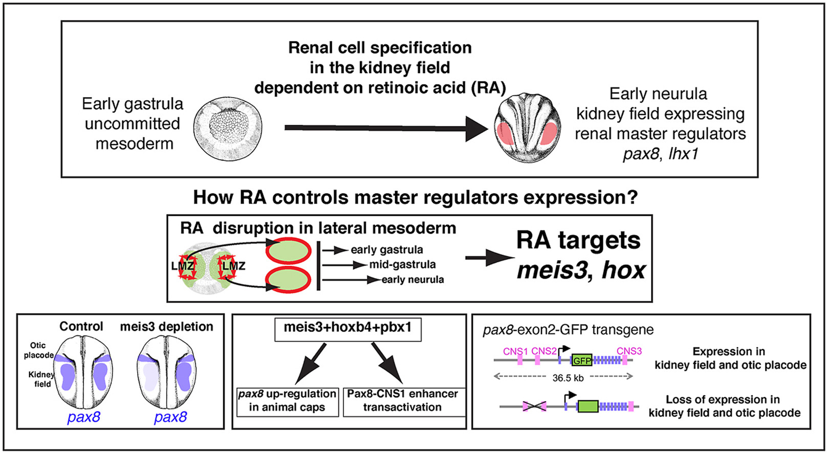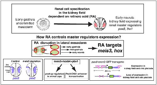 Development of the Xenopus pronephros relies on renal precursors grouped at neurula stage into a specific region of dorso-lateralmesoderm called the kidney field. Formation of the kidney field at early neurula stage is dependent on retinoic (RA) signaling acting upstream of renal master transcriptional regulators such as pax8 or lhx1. Although lhx1 might be a direct target of RA-mediated transcriptional activation in the kidney field, how RA controls the emergence of the kidney field remains poorly understood. In order to better understand RA control of renal specification of the kidney field, we have performed a transcriptomic profiling of genes affected by RA disruption in lateralmesoderm explants isolated prior to the emergence of the kidney field and cultured at different time points until early neurula stage. Besides genes directly involved in pronephric development (pax8, lhx1, osr2, mecom), hox (hoxa1, a3, b3, b4, c5 and d1) and the hox co-factor meis3 appear as a prominent group of genes encoding transcription factors (TFs) downstream of RA. Supporting the idea of a role of meis3 in the kidney field, we have observed that meis3 depletion results in a severe inhibition of pax8 expression in the kidney field. Meis3 depletion only marginally affects expression of lhx1 and aldh1a2 suggesting that meis3 principally acts upstream of pax8. Further arguing for a role of meis3 and hox in the control of pax8, expression of a combination of meis3, hoxb4 and pbx1 in animal caps induces pax8 expression, but not that of lhx1. The same combination of TFs is also able to transactivate a previously identified pax8 enhancer, Pax8-CNS1. Mutagenesis of potential PBX-Hox binding motifs present in Pax8-CNS1 further allows to identify two of them that are necessary for transactivation. Finally, we have tested deletions of regulatory sequences in reporter assays with a previously characterized transgene encompassing 36.5 kb of the X. tropicalis pax8 gene that allows expression of a truncated pax8-GFP fusion protein recapitulating endogenous pax8 expression. This transgene includes three conserved pax8 enhancers, Pax8-CNS1, Pax8-CNS2 and Pax8-CNS3. Deletion of Pax8-CNS1 alone does not affect reporter expression, but deletion of a 3.5 kb region encompassing Pax8-CNS1 and Pax8-CNS2 results in a severe inhibition of reporter expression both in the otic placode and kidney field domains.