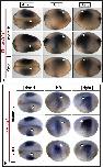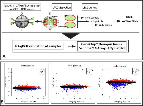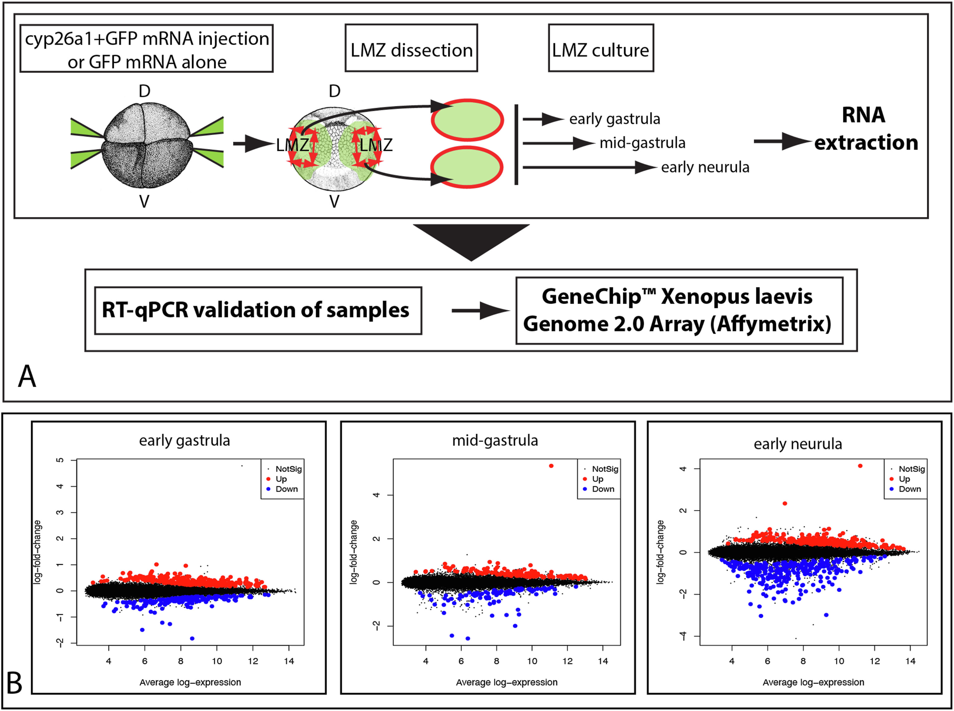 Fig. 1. Transcriptomic profiling of RA target genes in lateralmesoderm. A. Experimental workflow. LMZ explants are dissected at early gastrula stage from embryos previously injected with cyp26a1 and GFP mRNA (disruption of RA signaling), or GFP mRNA alone (control). Profiling is performed with batches of explants cultured until early gastrula, mid-gastrula or early neurula stages. B. Overview of DE analysis. Mean-difference plots of log-intensity ratios (differences) versus log-intensity averages (means) of Affymetrix probe sets at early gastrula, mid-gastrula or early neurula stages. Black dots correspond to probe sets with fdr >0.05, and thus excluded from DE analysis. Dots highlighted with blue correspond to probe sets whose expression is down-regulated upon RA disruption (RA-positive targets). Dots highlighted with red are probe sets whose expression is up-regulated upon RA disruption (RA-negative targets).