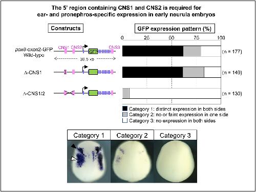 Fig. 7. A genomic region encompassing the CNS1 and CNS2 is required for otic placode- and pronephric kidney field-specific expression of pax8. A. GFP reporter constructs used for transgenesis experiments in X. laevis embryos (left) and bar graphs summarizing GFP expression patterns in the resulting embryos (right). The bar graphs show ratio of embryos showing distinct otic placode- and kidney field-specific expression in both sides (scored as the Category 1), no or faint expression in one side (Category 2), and no expression in both sides (Category 3). B. Representative embryos showing GFP expression scored as the Category 1, Category 2, and Category 3; dorsal view with anterior side to the top. Black and white triangles indicate expression in the otic placode and kidney field, respectively.