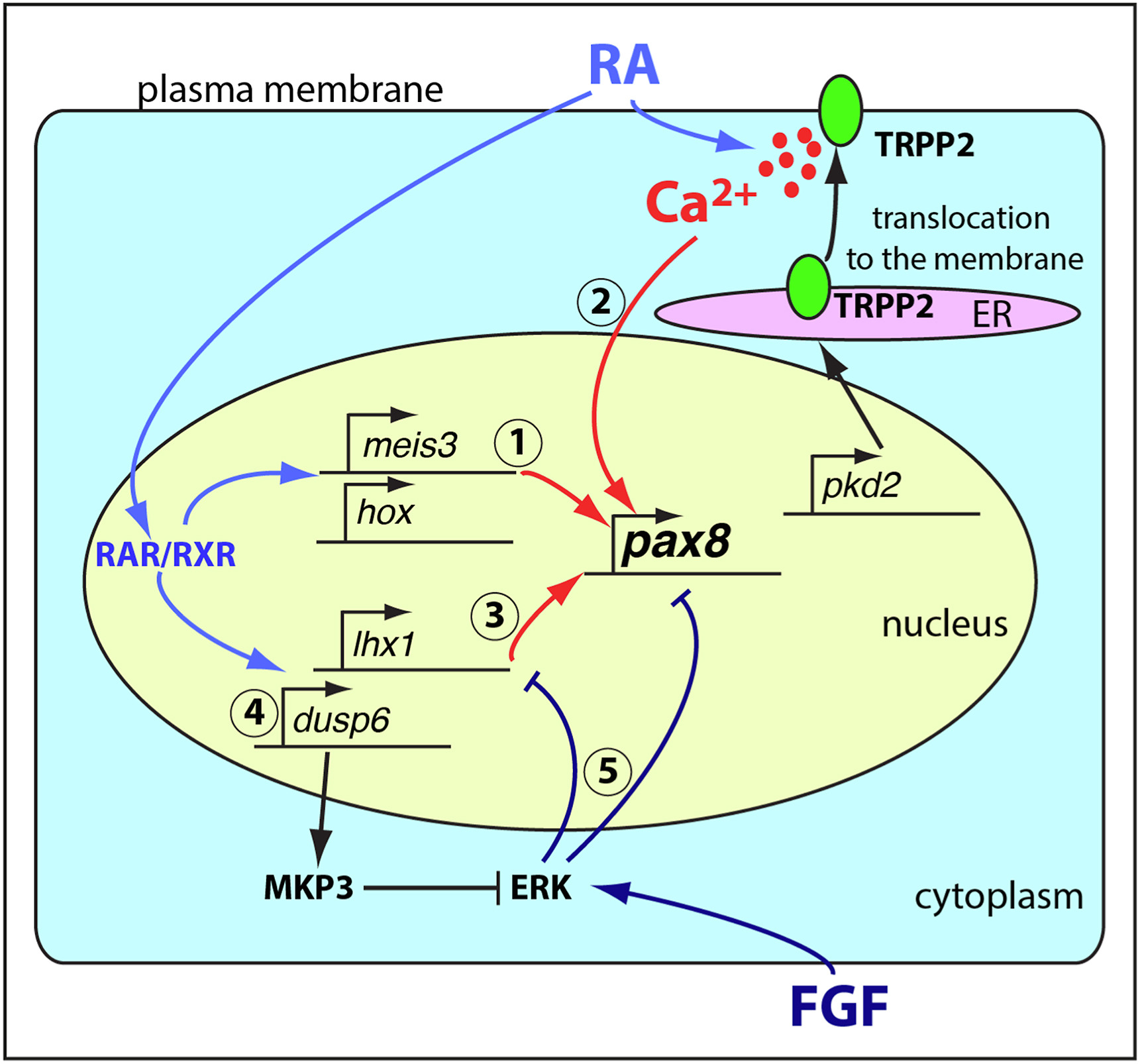Fig. 8. Working model based on present data and previously published results (Cartry et al., 2006; Cirio et al., 2011; Colas et al., 2008; Futel et al., 2015; Le Bouffant et al., 2012) illustrating the mechanisms that control pax8 expression in the kidney field. The present data (1) show that meis3 and hox are RA targets, and are involved in the direct regulation of pax8. They are cooperating with other RA-dependent inputs such as lhx1 (Cirio et al., 2011) (3), and a yet unidentified mechanism dependent on RA-dependent intracellular calcium signaling (Futel et al., 2015) (2). The FGF/erk pathway was previously shown to inhibit pax8 expression (Colas et al., 2008) (5) and can be negatively regulated by MKP3 that is encoded by dups6, another RA target (Le Bouffant et al., 2012)(this study) (4). ER: endoplasmic reticulum.