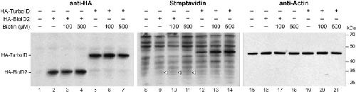 Fig. 2. TurboID requires no exogenous biotin. Experiments were performed as in Fig. 1A with the same constructs used in 1B. Embryos were cultured with 0, 100, or 500 μM supplemental biotin added to culture media. Immunoblot analysis with an anti-HA antibody was used to monitor the expression of injected mRNA (Lanes 1–7). Streptavidin-HRP assayed self-biotinylation of each enzyme as a readout of enzyme activity (Lanes 8–14). Blots were stripped and re-probed with anti-actin antibody to assess sample loading (Lanes 15–21). Open triangles indicate where biotinylation of BioID2 is to be expected. Figure is representative of three biological replicates.