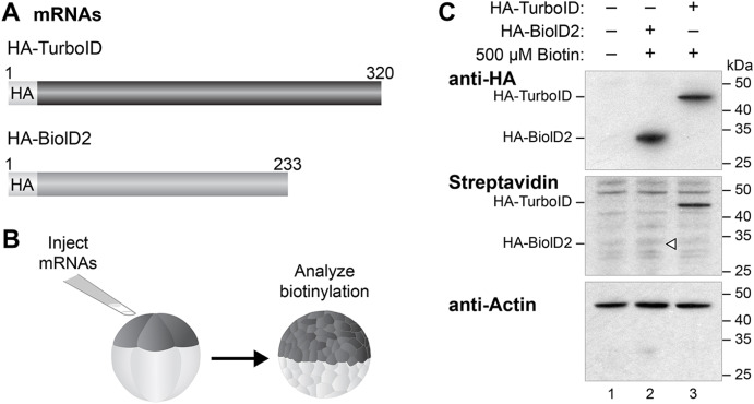 Fig. 1. TurboID is an efficient biotin ligase in Xenopus embryos. (A) Diagrams of HA-tagged TurboID and BioID2. (B) Assay for biotin ligase mediated-biotinylation. Two-cell Xenopus embryos were injected with mRNA encoding either HA-tagged BioID2 or HA-tagged TurboID with biotin supplemented in the culture media at indicated concentrations. When embryos reached stage 7, protein was extracted for analysis of biotinylation. (C) Immunoblot analysis with an anti-HA antibody was used to monitor the expression of injected mRNA (Lanes 1–3, top panel). Streptavidin-HRP assayed self-biotinylation of each enzyme as a readout of enzyme activity (Lanes 1–3, middle panel). Blots were stripped and re-probed with actin to assess sample loading (Lanes 1–3, bottom panel). Open triangles indicate where biotinylation of BioID2 is to be expected. Figure is representative of three biological replicates.