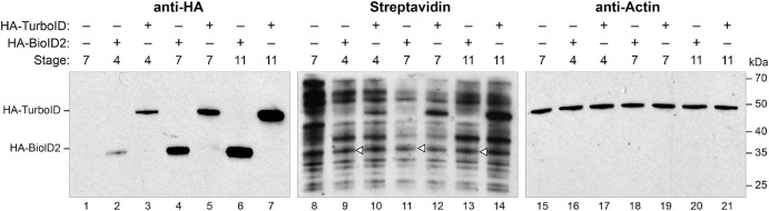 Fig. 4. Biotinylation by TurboID occurs rapidly in Xenopus embryos. Experiments were performed as in Fig. 1A with the same mRNAs as in 1B. Embryos were allowed to develop to stage 4, 7, or 11 before harvesting. As in previous figures, immunoblot analysis with an anti-HA antibody was used to monitor the expression of injected constructs (Lanes 1–7). Streptavidin-HRP assayed self-biotinylation of each enzyme as an indication of enzyme activity (Lanes 8–14). Blots were stripped and re-probed with anti-actin antibodies to assess sample loading (Lanes 15–21). Open triangles indicate where biotinylation of BioID2 is to be expected. Figure is representative of three biological replicates.