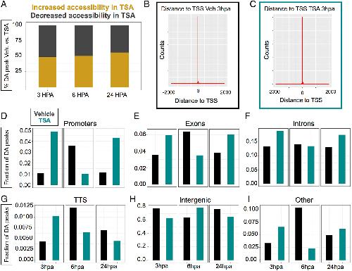 HDAC inhibition alters chromatin accessibility during X. tropicalis tail regeneration. (A) Proportions of differentially accessible peaks that have increased accessibility in TSA relative to the vehicle (gold) or decreased accessibility in TSA relative to the vehicle (black) at each regeneration timepoint. (B) Representative histograms show distance of peaks calls to the transcription start site (TSS) in vehicle-treated tadpoles. (C) Representative histograms show distance of peaks calls to the transcription start site (TSS) in TSA-treated tadpoles. (D–I) Peaks flagged as having increased accessibility in the vehicle relative to TSA treatment (black), or in the TSA treatment relative to the vehicle (teal) for each timepoint were annotated to genomic features. The proportion of these differentially accessible peaks assigned to each genomic feature are plotted at 3, 6, and 24 hpa. (D) Promoters, (E) Exons, (F) Introns, and (G) Transcription termination site (TTS). (H) Intergenic regions and (I) Other genomic features. [Color figure can be viewed at wileyonlinelibrary.com] |