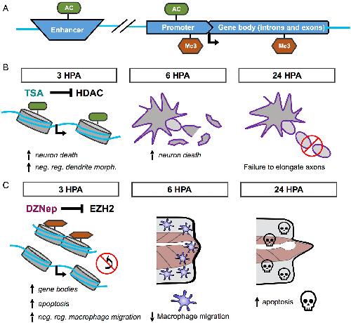 Model for potential roles of HDAC and EZH2 activity in regeneration. (A) Gene model with proposed genomic features that may be regulated by acetylation or H3K27me3. (B) Model for the early role of HDAC activity in regeneration. (C) Model for the early role of EZH2 activity in regeneration. [Color figure can be viewed at wileyonlinelibrary.com] |