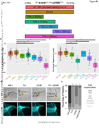 Figure S1. HDAC and EZH2 activity are necessary for regeneration of tissues. (A) Experimental schematic of treatment windows during regeneration. (B) Tail regeneration length during windows of TSA treatment. (C) Tail regeneration length during windows of DZNep treatment. (B,C) *p < .05 ANOVA with Tukey's post hoc. (D) DIC and DAPI images of regenerating tails; (E) Tail regeneration phenotypes during various drug treatments. *p < .05 chi-square test |
