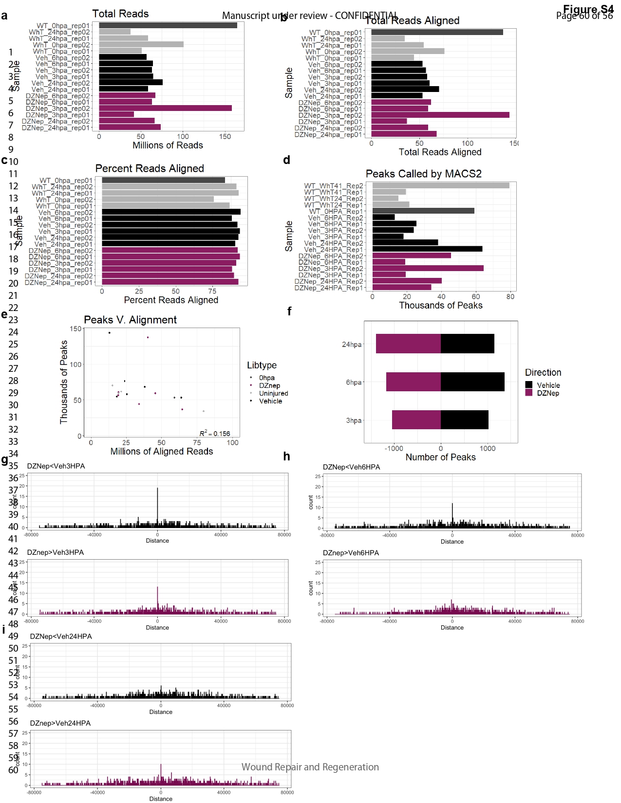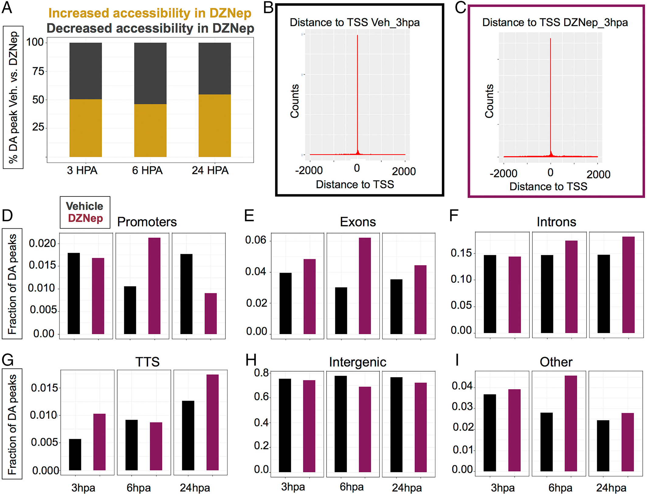 Figure S4. Quality metrics of DZNep and vehicle control ATAC-seq datasets. (a–i) 0 hpa dark grey, uninjured tails dark grey, vehicle black, DZNep treated maroon. (a) Total reads for each sequencing library. (b) total reads aligned for each library. (c) percentage of reads aligned. (d) Number of peaks called by MACS2. (e) Peak versus alignment. (f) Number of peaks during regeneration time points. (g–i) Differentially accessible peaks distance to TSS |