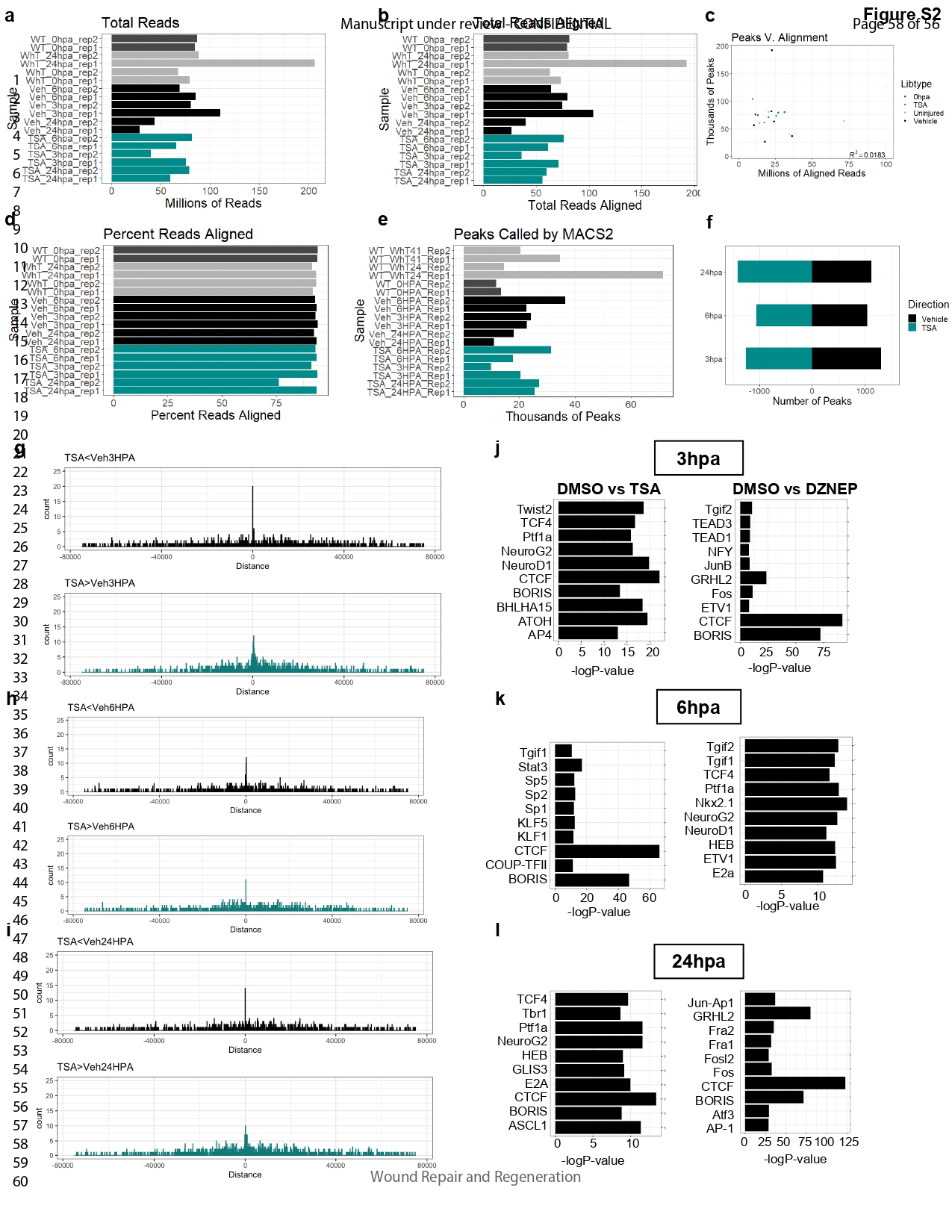 Figure S2. Quality metrics of TSA and Vehicle control ATAC-seq datasets. (A–I) 0 hpa dark grey, uninjured tails dark grey, vehicle black, TSA treated teal. (A) Total reads for each sequencing library. (B) Total reads aligned for each library. (C) percentage of reads aligned. (D) Number of peaks called by MACS2. (E) Peak versus alignment. (F) Number of peaks during regeneration time points. (G–I) Differentially accessible peaks distance to TSS. (J) Top 10 enriched transcription factor binding motifs in at 3 hpa in (left) vehicle treated condition relative to TSA and (right) vehicle treated relative to DZNep treatment. (K) Top 10 enriched transcription factor binding motifs in 6 hpa in (left) vehicle treated condition relative to TSA and (right) vehicle treated relative to DZNep treatment. (L) Top 10 enriched transcription factor binding motifs at 24 hpa in (left) vehicle treated condition relative to TSA and (right) vehicle treated relative to DZNep treatment. |