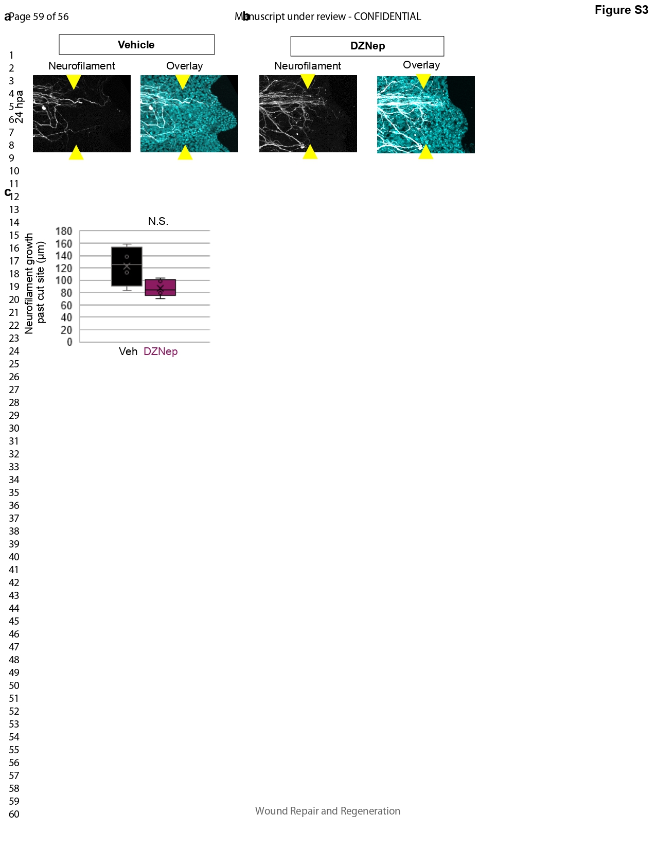 Figure S3. Neurofilament outgrowth. (a,b) Immunoflourescence of neurofilament at 24 hpa (a) vehicle, (b) DZNep. (c) Quantification of neurofilament outgrowth (n = 4–5, N.S. two tailed t-test). |