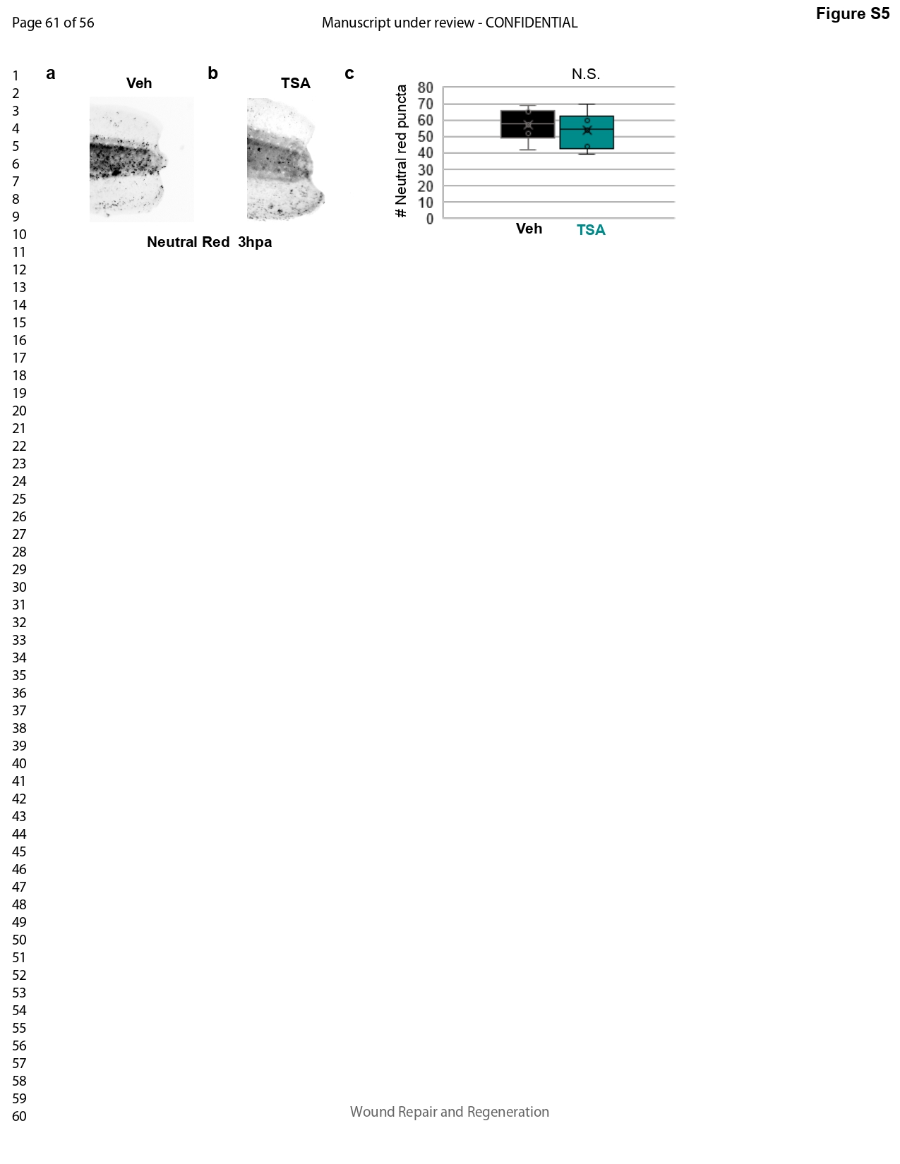 Figure S5. Neutral red staining. (a,b) Neutral red staining at 3 hpa (a) vehicle, (b) TSA. (c) Quantification of Neutral red puncta (n = 5–6, N.S. two tailed t-test). |