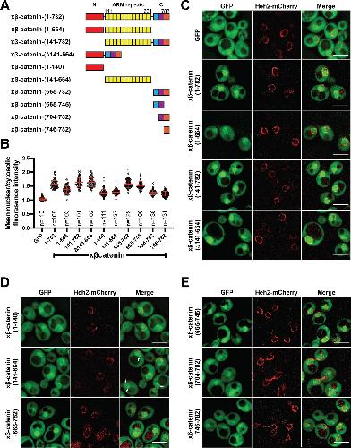 Figure 2 with 3 supplements The C-terminus of β-catenin contains a nuclear localization signal (NLS). (A) Schematic of Xenopus β-catenin truncation constructs tested in this study. (B) Plot of the ratio of mean nuclear to cytosolic fluorescence intensity of Xenopus β-catenin GFP truncation constructs tested in a wildtype yeast strain from 30 to 40 cells from three independent replicates. Red bar indicates the mean value with the SD. (C) Deconvolved fluorescence images of the N-terminal deletion (141-782), ARM-repeats deletion (Δ141-664) and C-terminal deletion (1-664) of Xenopus β-catenin GFP in the wildtype strain. GFP and full-length Xenopus β-catenin-GFP were used as controls. (D) Deconvolved fluorescence images of the indicated fragments of Xenopus β-catenin GFP in the wildtype strain. White arrows indicate nuclear rim localization. (E) Deconvolved fluorescence images of indicated C-terminus fragments of Xenopus β-catenin GFP in the wildtype strain. Heh2-mCherry was co-expressed to label the nuclear envelope in (C), (D), and (E). Scale bar is 5 µm in (C), (D), and (E). The data is uploaded as Figure 2—source data 1. |