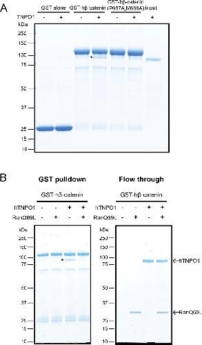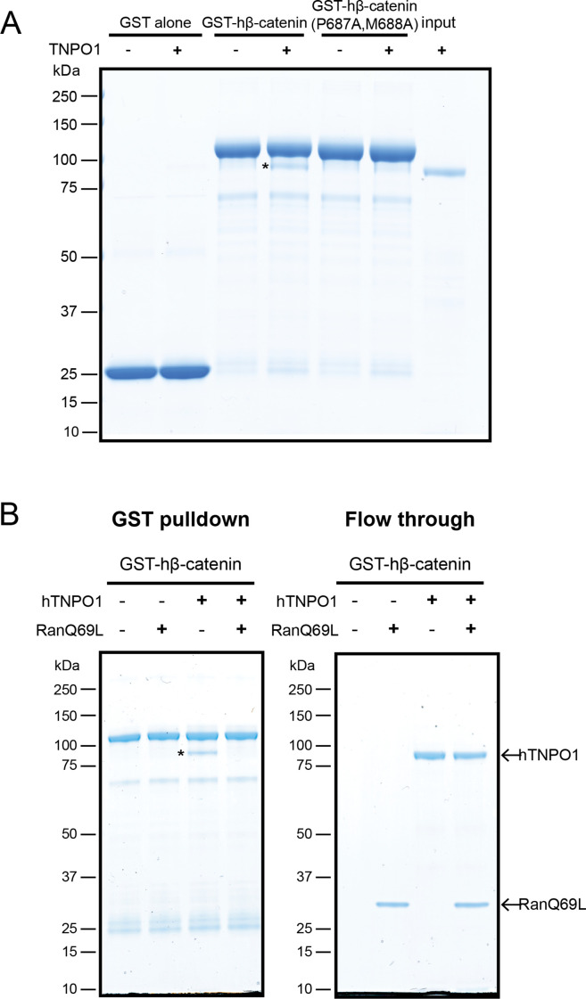 Figure 5. Direct binding of β-catenin and TNPO1 is destabilized by Ran-GTP.(A) In vitro binding assay of purified recombinant TNPO1 and GST fusions of human β-catenin and human β-catenin containing the PM to AA mutations. GST alone was used as a negative control. (B) In vitro binding assay of purified recombinant TNPO1 to GST fusions of human β-catenin in the presence of GTP hydrolysis deficient Ran mutant loaded with GTP (RanQ69L). Proteins were separated by sodium dodecyl sulfate–polyacrylamide gel electrophoresis (SDS-PAGE) and stained with Coomassie blue in (A) and (B). * indicates TNPO1 bound to GST-hβ-catenin. |