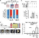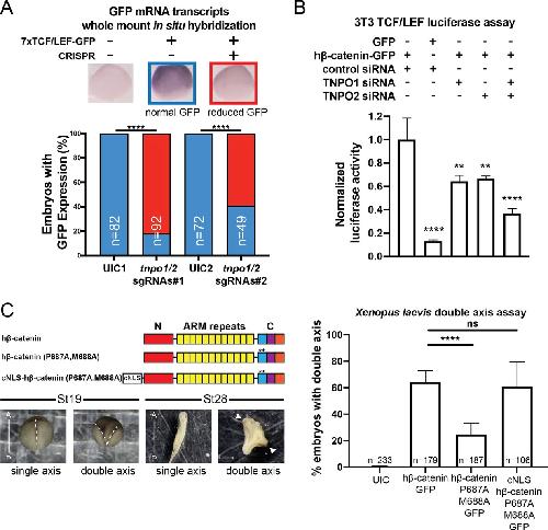 Figure 6. TNPO1/2 and the β-catenin nuclear localization signal (NLS) are required for Wnt signaling in vivo.(A) Depletion of tnpo1 and tnpo2 using two different pairs of non-overlapping sgRNAs represses gfp expression in Xenopus tropicalis Tg(pbin7Lef-dGFP) embryos at stage 10. Key used to quantify embryos with whole mount in situ hybridization (WMISH) signal (blue – normal gfp signal nd red – reduced gfp signal). Uninjected control (UIC) embryos were used as a negative control. (B) siRNA mediated TNPO1 and/or TNPO2 knockdown reduces luciferase activity in mouse embryonic fibroblasts that harbor a stable integration of luciferase under the control of TCF/LEF promoters. Wnt signaling was activated by human β-catenin-GFP overexpression. Control siRNA and GFP were used as negative controls. Experiments were performed in triplicate. (C) Schematic diagram of three β-catenin constructs used in the double axis assay in Xenopus laevis. ** indicates P687A, M688A substitutions (top left). Dorsal views of X. laevis embryos with anterior to the top (bottom left). Dotted lines indicate the embryonic axis, and the white arrows indicate the head. Histogram of the percent of embryos with secondary axes from three independent replicates. p-Values are from Fisher’s exact test (A) and (C) and unpaired two-tailed t-test (B) where ns is p>0.05, p<0.05 (*), 0.0021 (**), 0.0002 (***), and p<0.0001 (****).The data is uploaded as Figure 6—source data 1. Figure 6—source data 1. Source data related to Figure 6. |
