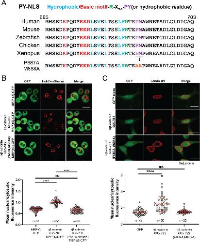 Figure 4. β-catenin contains a PY-NLS that is required for nuclear import.(A) Conservation of amino acid sequences that conform to the PY-NLS consensus (top, from Soniat and Chook, 2015) in the C-terminus of β-catenin. (B) Deconvolved fluorescence images of wildtype yeast cells expressing MBP(x3)-GFP tagged with the Xenopus β-catenin nuclear localization signal (NLS) (665-703) and also an NLS that contains the PM to AA mutation (top). Untagged MBP(x3)-GFP was used as a control. Plot of the ratio of mean nuclear to cytoplasmic fluorescence intensity from a single experiment (bottom). Scale bar is 5 µm. (C) Representative fluorescence image of HeLa cells expressing human β-catenin (665-782) or the PM to AA mutant version (top). LaminB1 was labeled to locate the nuclear envelope. GFP alone was used as a control. Plot of the ratio of mean nuclear to cytoplasmic fluorescence intensity from three experiments (bottom). Scale bar is 15 µm. p-Values are from unpaired two-tailed t-test where ns is p>0.05 and ****p<0.0001 for both (B) and (C). The data is uploaded as Figure 4—source data 1. Figure 4—source data 1. Source data related to Figure 4. |