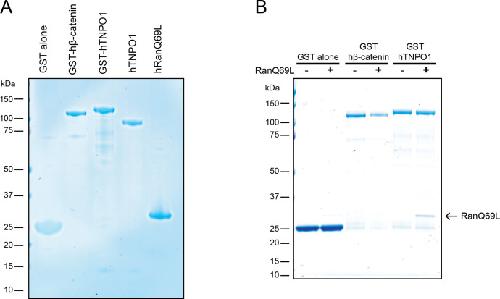 Figure 5—figure supplement 1. TNPO1 selectively binds to RanGTP in vitro.(A) Generation of recombinant GST fusions of human β-catenin and TNPO1 and RanQ69L in vitro. (B) In vitro binding assay of purified recombinant RanQ69L to GST fusions of human TNPO1. GST fusions of human β-catenin and RanQ69L buffer were used as a control. Proteins were separated by SDS-PAGE and stained with Coomassie blue in (A) and (B). |