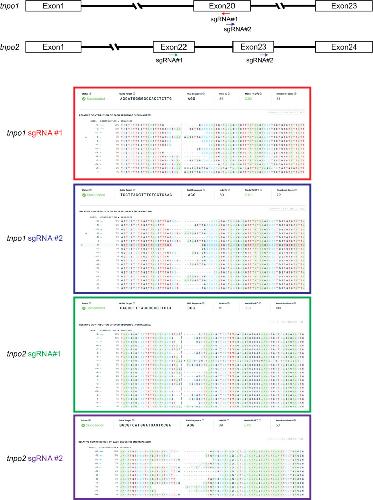 Figure 6—figure supplement 2. X. tropicalis tnpo1 and tnpo2 gene depletion by CRISPR/Cas9.Schematic diagram of tnpo1 and tnpo2 sgRNA target sites (top). Inference of CRISPR Edits (ICE) analysis of indel mutations at predicted target sites (bottom). |