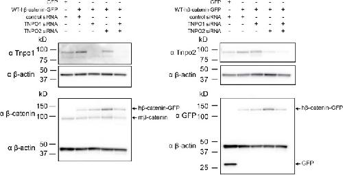 Figure 6—figure supplement 3. Western blots of Tnpo1/2 and β-catenin from 3T3 TCF/LEF luciferase assays.Western blot demonstrating the efficacy of siRNA mediated Tnpo1 and Tnpo2 depletion in mouse embryonic fibroblast Wnt reporter cell lines. |