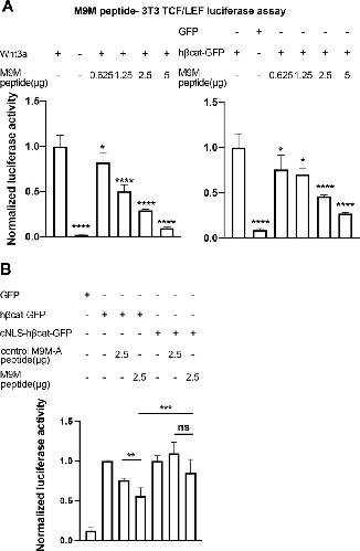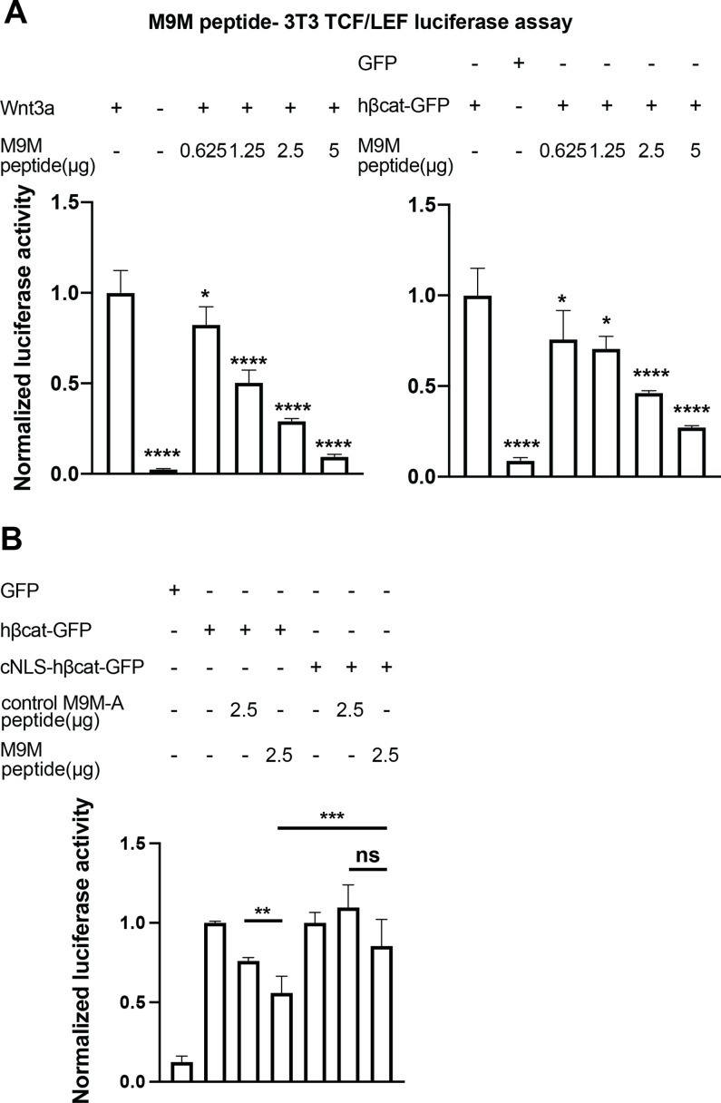 Figure 7. The M9M peptide inhibits Wnt signaling.Wnt signaling was activated by Wnt3a (A, left), human β-catenin-GFP overexpression (A, right and B), or cNLS-human β-catenin-GFP (B). No Wnt3a or GFP overexpression were used as negative controls. Experiments were performed in triplicate (A) or duplicate in two independent experiments (B). p-Values are from unpaired two-tailed t-test where ns is p>0.05, p<0.05 (*), 0.0021 (**), 0.0002 (***), and p<0.0001 (****). The data is uploaded as Figure 7—source data 1. Figure 7—source data 1. Source data related to Figure 7. |