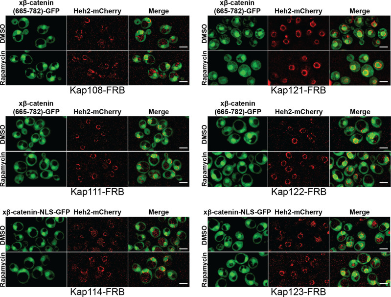 Figure 3—figure supplement 1. Sub-cellular localization of Xenopus β-catenin (665-782)-GFP in Anchor-Away strains in Saccharomyces cerevisiae.Representative deconvolved fluorescence image of xβ-catenin (665-782)-GFP treated with DMSO (carrier) or rapamycin in the indicated nuclear transport receptor (NTR)-FKBP-rapamycin binding (FRB) strain. Heh2-mCherry was used as a nuclear membrane marker. Scale bar is 5 µm. |